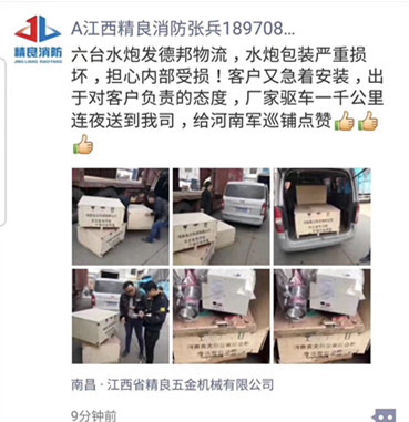 2018年10月,南昌客戶需要6臺30L的智能消防水炮,軍巡鋪廠家在簽訂合同后按時發貨,可誰知客戶提貨的時候發現 智能消防水炮的外包裝箱已經破碎,產品損壞程度不詳。 當時客戶非常...